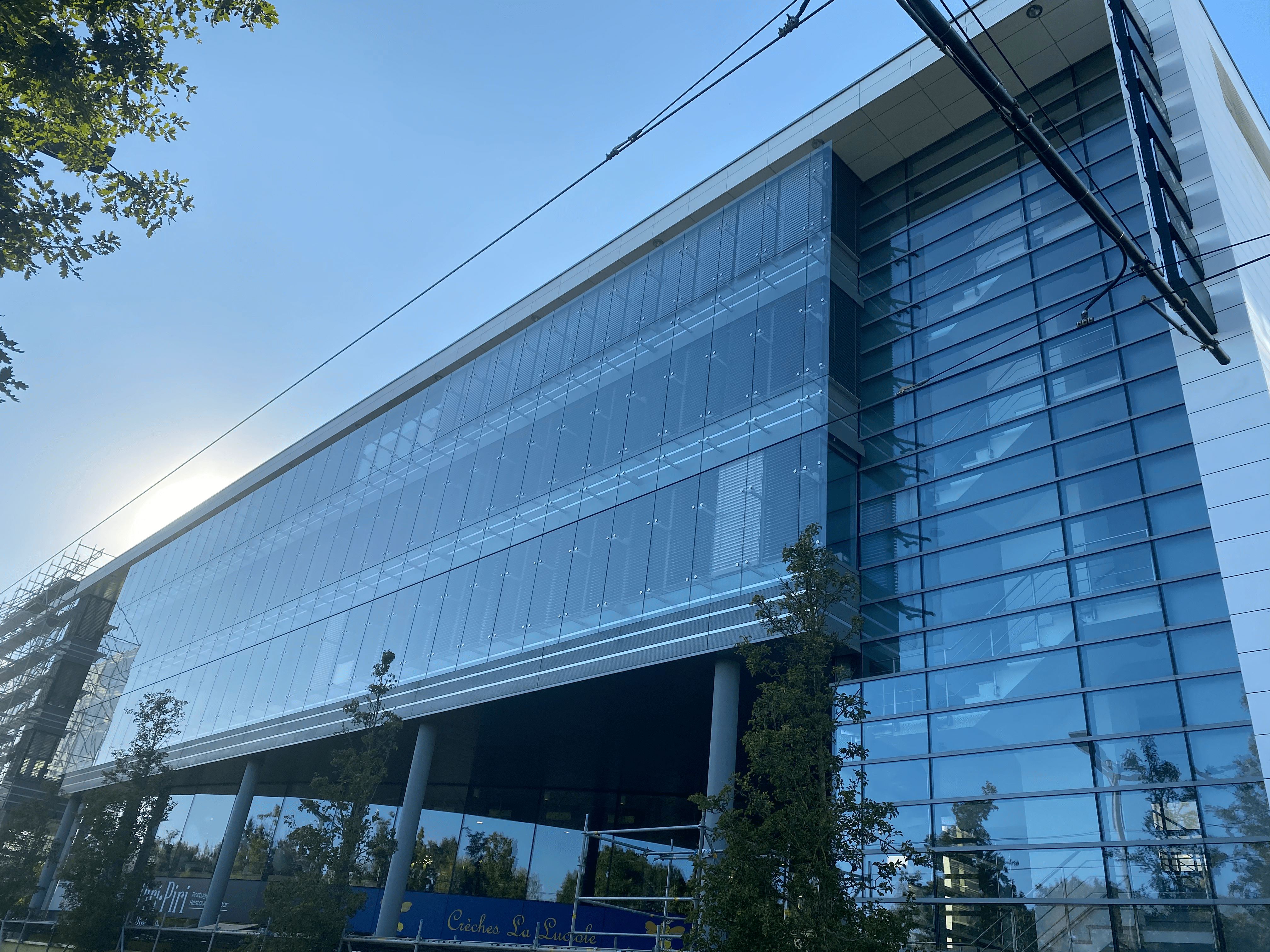 Es beeindruckt durch seine futuristische Fassade, die sowohl ästhetisch ansprechend als auch funktional gestaltet ist. Die Struktur aus Glas und Stahl schafft eine helle, offene Atmosphäre, die den Innenräumen eine großzügige und einladende Wirkung verleiht.
