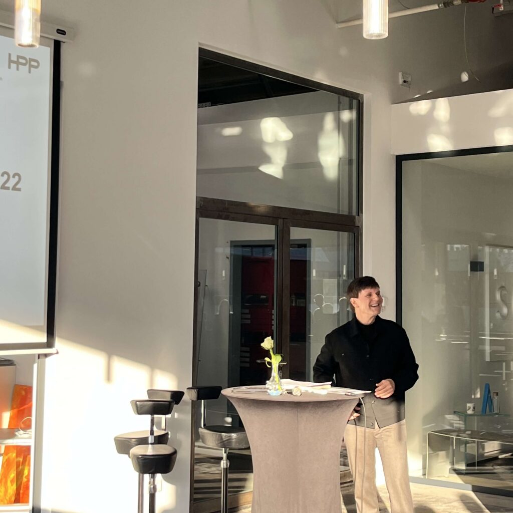 Ralph Icks eröffnete den Abend mit einem Einblick in die Geschichte und Zukunft unseres Unternehmens. Heute sind wir spezialisiert auf Fassadensanierung, Spezialverglasungen, Innenausbau und Brandschutz. Als aktiver Teil des Stadtlebens tragen wir zur Stadtentwicklung bei – nachhaltig und zukunftsorientiert. Unsere Ökoprofit-Zertifizierung sowie die Partnerschaft im Düsseldorfer Mobilitäts- und Klimapakt unterstreichen dieses Engagement.