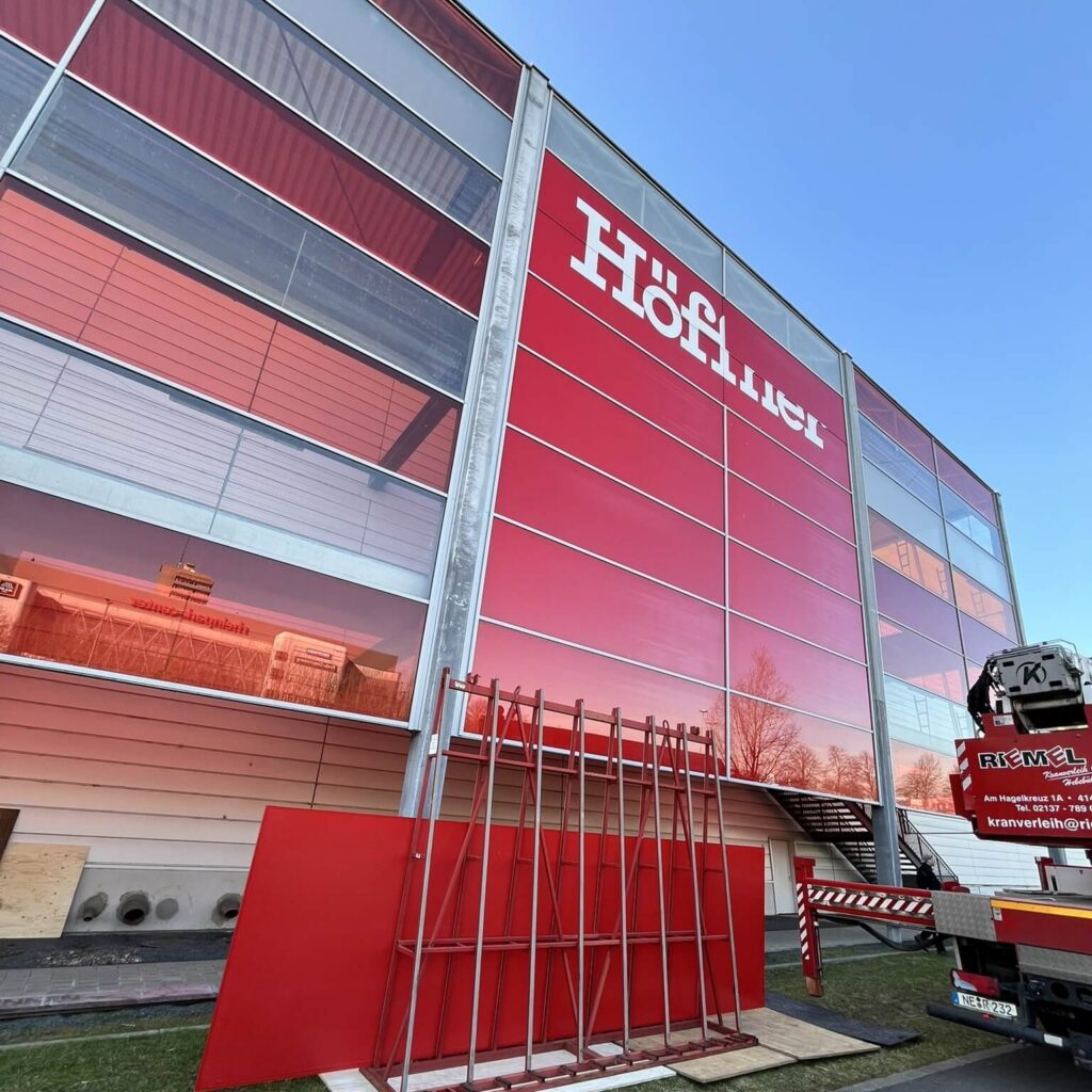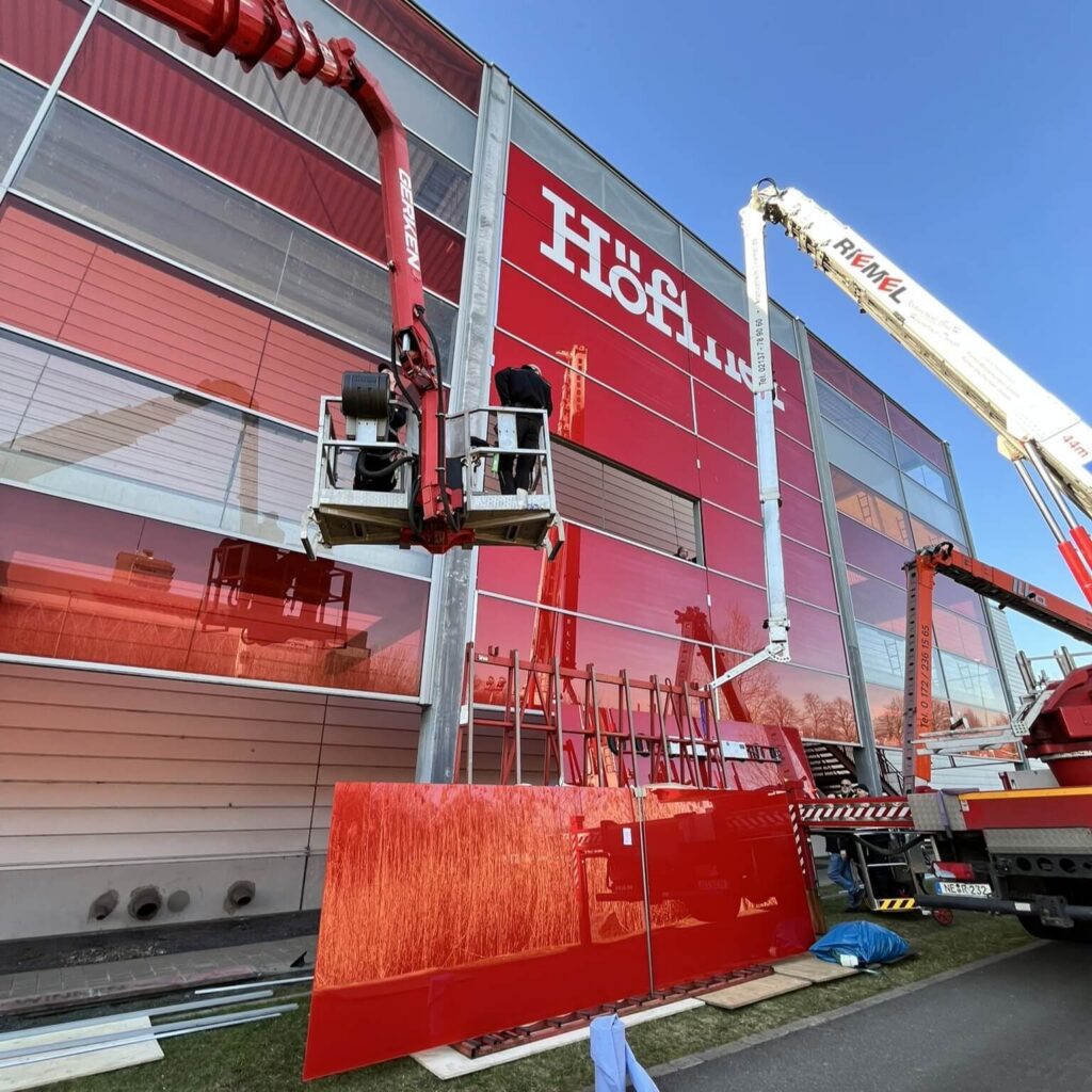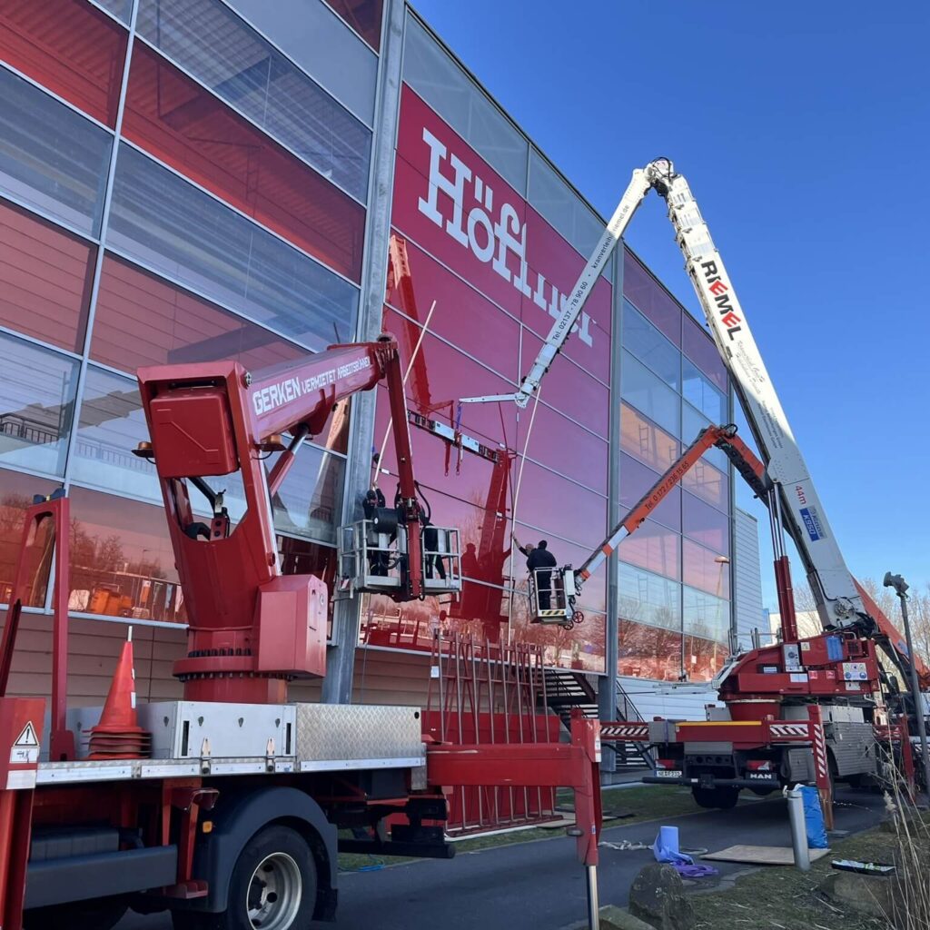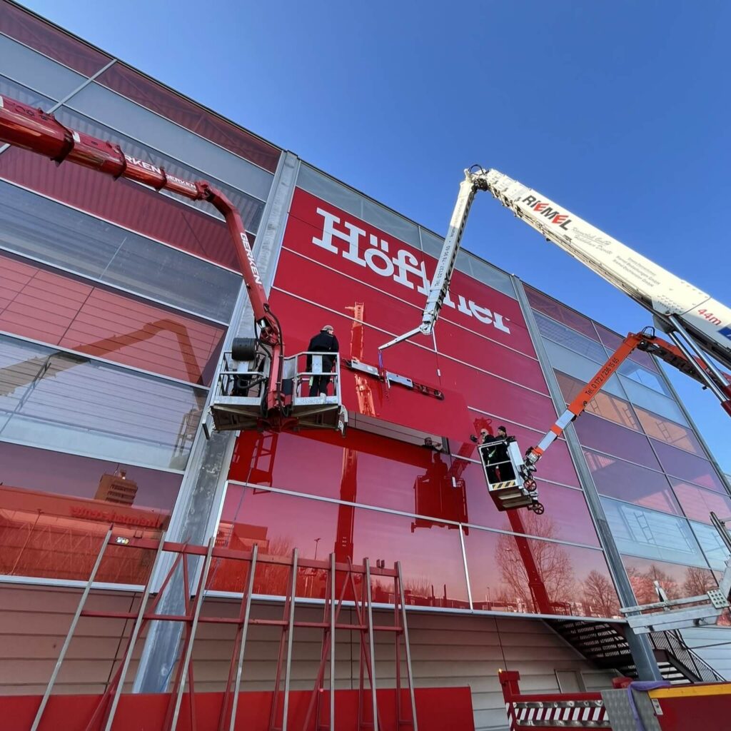 Unser aktuelles Projekt bei Höffner zeigt einmal mehr, was unser Team leisten kann – auch wenn’s richtig groß wird. Die Fassade des Gebäudes wurde umfassend saniert. Besonders beeindruckend: Der Ein- und Ausbau mehrerer Glasscheiben mit einer Länge von 5,60 Metern.