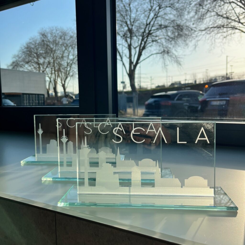 Ein besonderes Highlight für uns war die Möglichkeit, die Preise für die Sieger beisteuern zu dürfen: Unsere sandgestrahlten Glasplatten mit Düsseldorfer Skyline wurden auf dem Podium überreicht – individuell gestaltet und von uns per Hand gefertigt, als Unikate, die präzises Handwerk mit regionaler Identität verbinden. So entstand nicht nur eine Auszeichnung, sondern auch ein bleibendes Andenken: ein Stück Düsseldorf zum Mitnehmen.